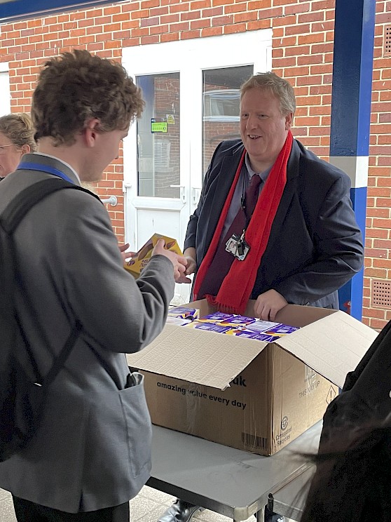 "Last week, I had the pleasure of joining the team at The Portsmouth Academy to congratulate and reward pupils for good attendance. They have launched the 100% campaign, an initiative to acknowledge pupils who have 100% attendance over a period of time with a sweet treat. With the Easter break just around the corner, of course the school chose Easter eggs for 478 pupils to enjoy, an increase of 52 since last term. Well done to everyone involved."