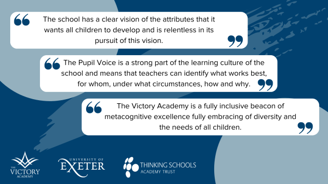 Principal of The Victory Academy, Michelle Smith, says “The staff at The Victory Academy work tirelessly to transform the life chances of our students, support their progress and develop their thinking. I couldn’t be prouder that the University of Exeter’s School of Education recognises our commitment to our young people and awarded us the Advanced Thinking School Accreditation. Thank you to everyone involved who worked so hard to achieve this award.”