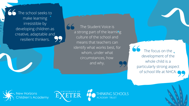 New Horizons was praised for providing additional work on a national level, supporting schools across Plymouth and Portsmouth, and running a number of workshops at Trust conferences. The school “is working with the Assistant Head of a school in China on using meta-cognitive language aligned to Thinking Tools” and have recently been a part of a “research group for a new book on Retrieval Practice.” The University of Exeter states, “There is a clear and effective programme of dissemination across the whole multi-academy, the Thinking Schools network, regionally, nationally, and internationally which includes contributions to conferences and publications.”